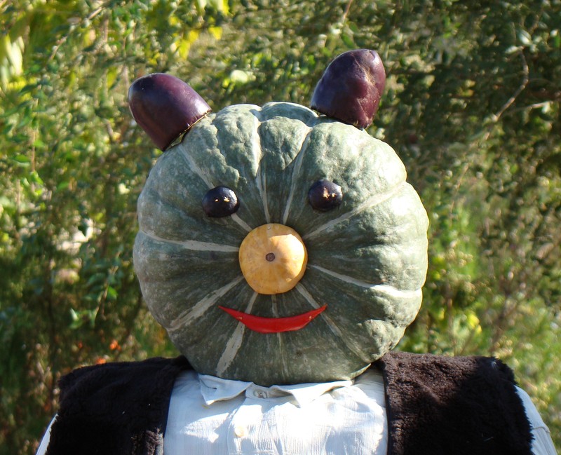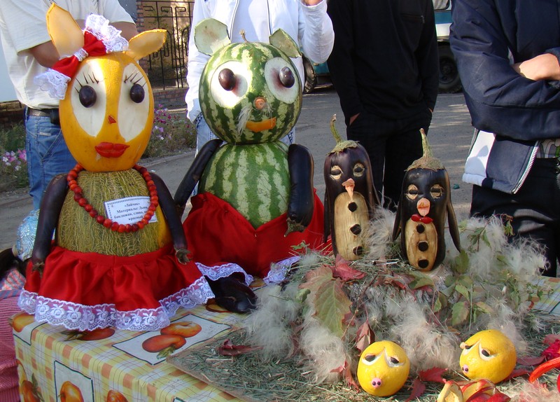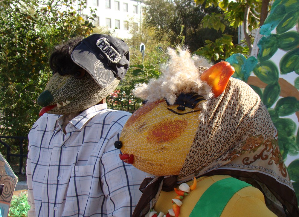 Поделки школьников на праздновании "Золотой осени Байконура" в конце сентября. Использован кустик "перекати-поля" (Ceratocarpus utriculosus), растения с клумб города — Ricinus communis, Tagetes. С рынка (или с бахчи-огорода родственников) — Citrullus lanatus, Melo sativus, Cucurbita, Solanum melongena, Daucus sativus, Capsicum annuum, Brassica oleracea var. botrytis. Явно привозные — Pyrus communis, Malus domestica, Prunus domestica. [осень]