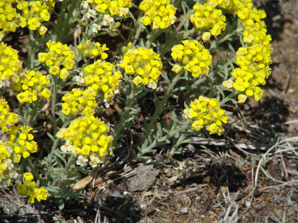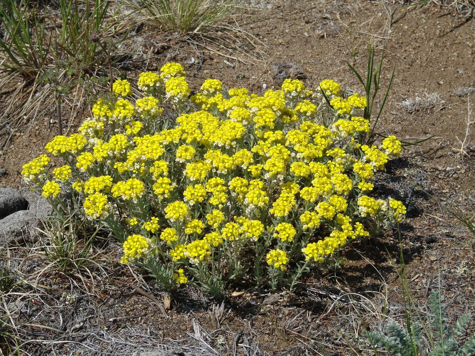 Степной склон с цветущими (жёлтые) Alyssum lenense, (белые) Ferulopsis hystrix и Smelowskia alba, далее видны деревья Larix sibirica. 09.06.2017. [лето]