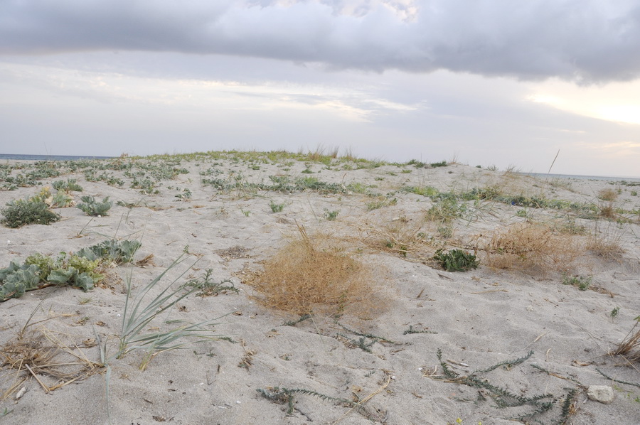 Прибрежная песчаная полоса. Преобладают вегетирующие и плодоносящие Eryngium maritimum, Cynanchum acutum и Gypsophila perfoliata. [конец лета — начало осени]