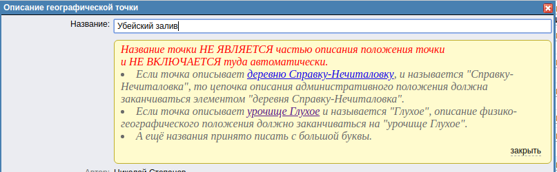 | Татьяна Винокурова | Я с перепугу начала проверять срочно свои точки, сверяя название с окончанием цепочки адм. и физ.-гео. описания, ибо тоже слегка проигнорировала справку-нечиталовку  Как так-то?! |