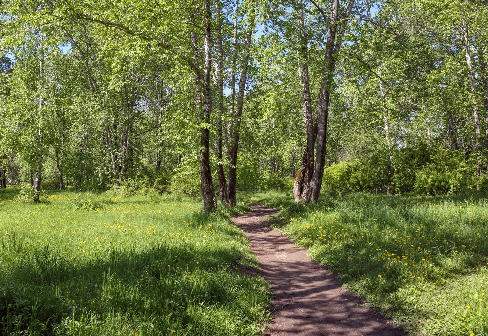 Разнотравный луг с цветущим Taraxacum officinale в тополёвой роще (Populus nigra) вдоль тропинки. На дальнем плане слева от центральной группы деревьев — кусты Physocarpus opulifolius. 23.05.2020. [конец весны — начало лета]