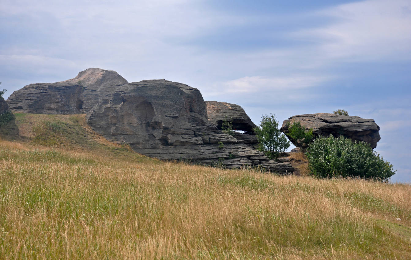Скалы на степном склоне на юго-восточном берегу оз. Большие Аллаки. Возле скал растут ивы и рябина. 24.07.2020. [лето]