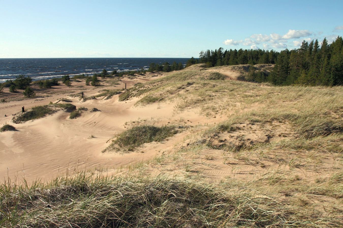 Гребень дюны с псаммофильным злаковым сообществом из Leymus arenarius и Festuca ovina; вдали — сухой сосняк. 14.09.2020. [осень]