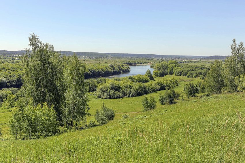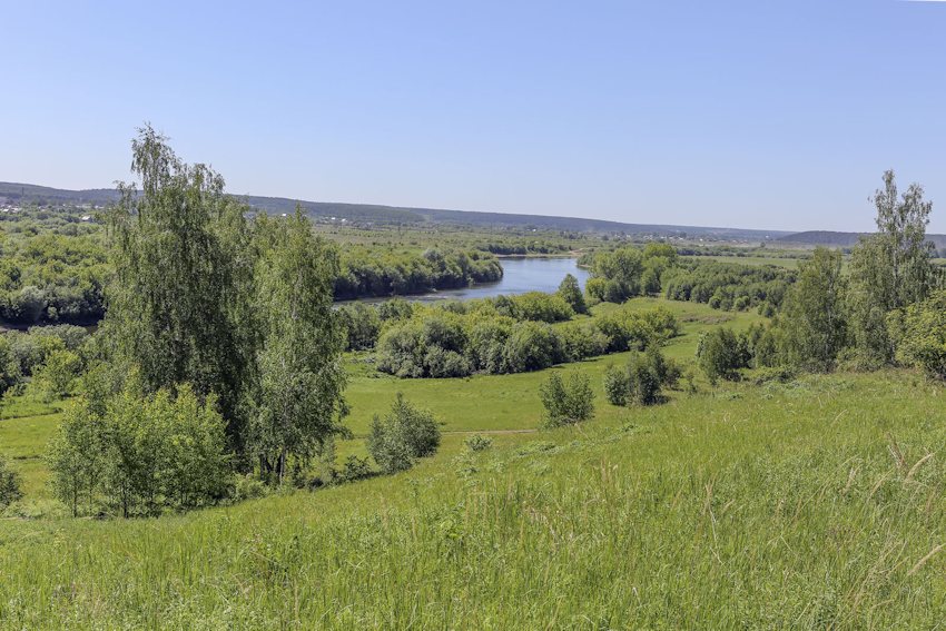 Вид с одной из вершин на долину р. Сылва вниз по течению. Внизу у берега — урёмный лес (Salix, Padus avium, Alnus). Холмы заняты разнотравными лугами и берёзовыми рощами. 05.06.2021. [лето]