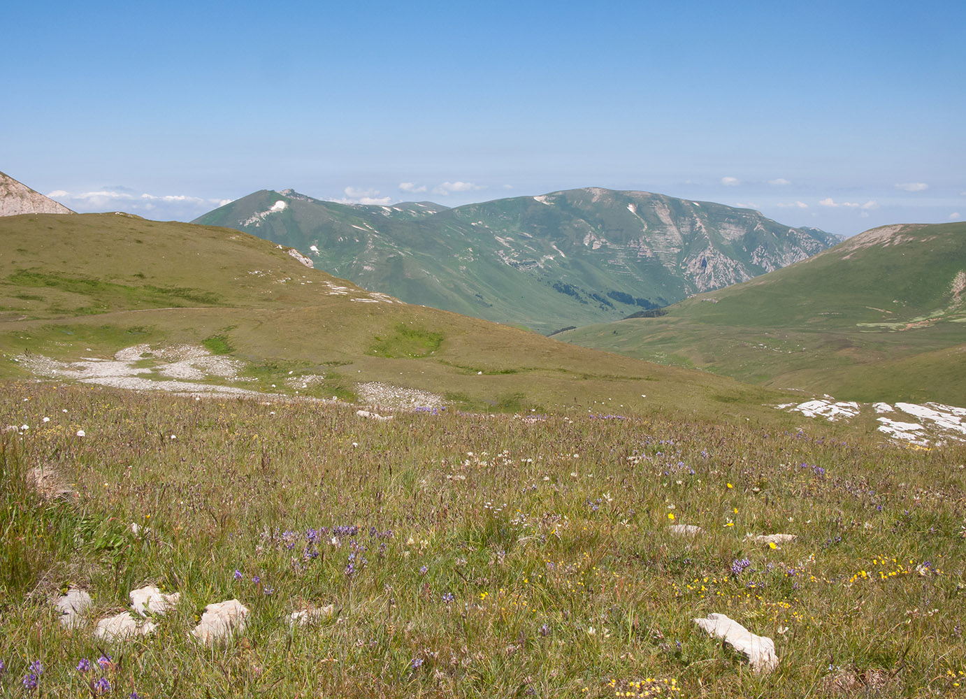 Субальпийский луг с аспектом Festuca woronowii. Заметны цветущие голубым Oxytropis lazica, жёлтые соцветия — Anthemis marschalliana ssp. pectinata, белые — Trifolium polyphyllum. На заднем плане — гора Нагой-Чук (2467 м н.у.м.). 18.07.2015. [лето]