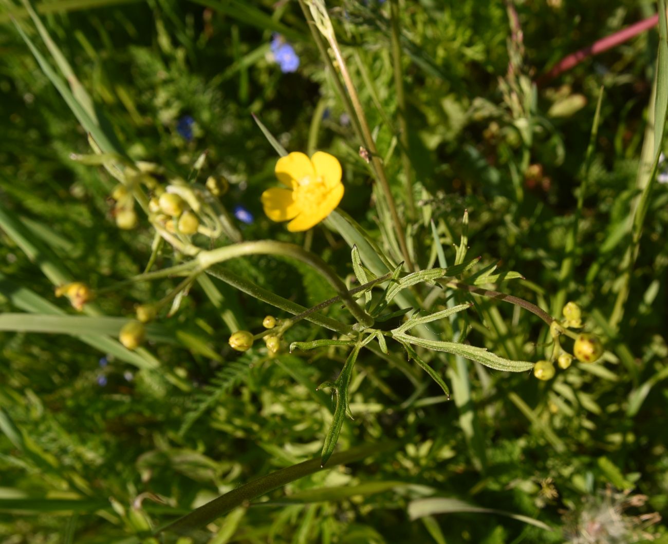 Луг между деревней Марьино и деревней Борисово. Цветёт Ranunculus polyanthemos. Вдали виден смешанный лес: дуб, ель, рябина, черемуха. 7 июня 2022 г. [конец весны — начало лета]