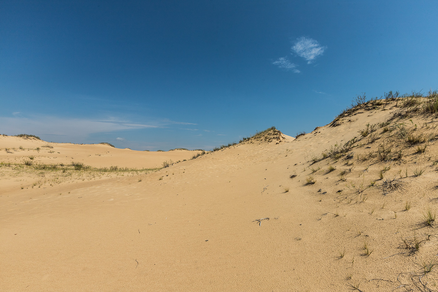 Почти лишённые растительности склоны барханов. Гребни барханов поросли различными видами злаков, среди которых выделяется Leymus racemosus, кустарничками Artemisia tschernieviana и др. 24.07.2022. [лето]