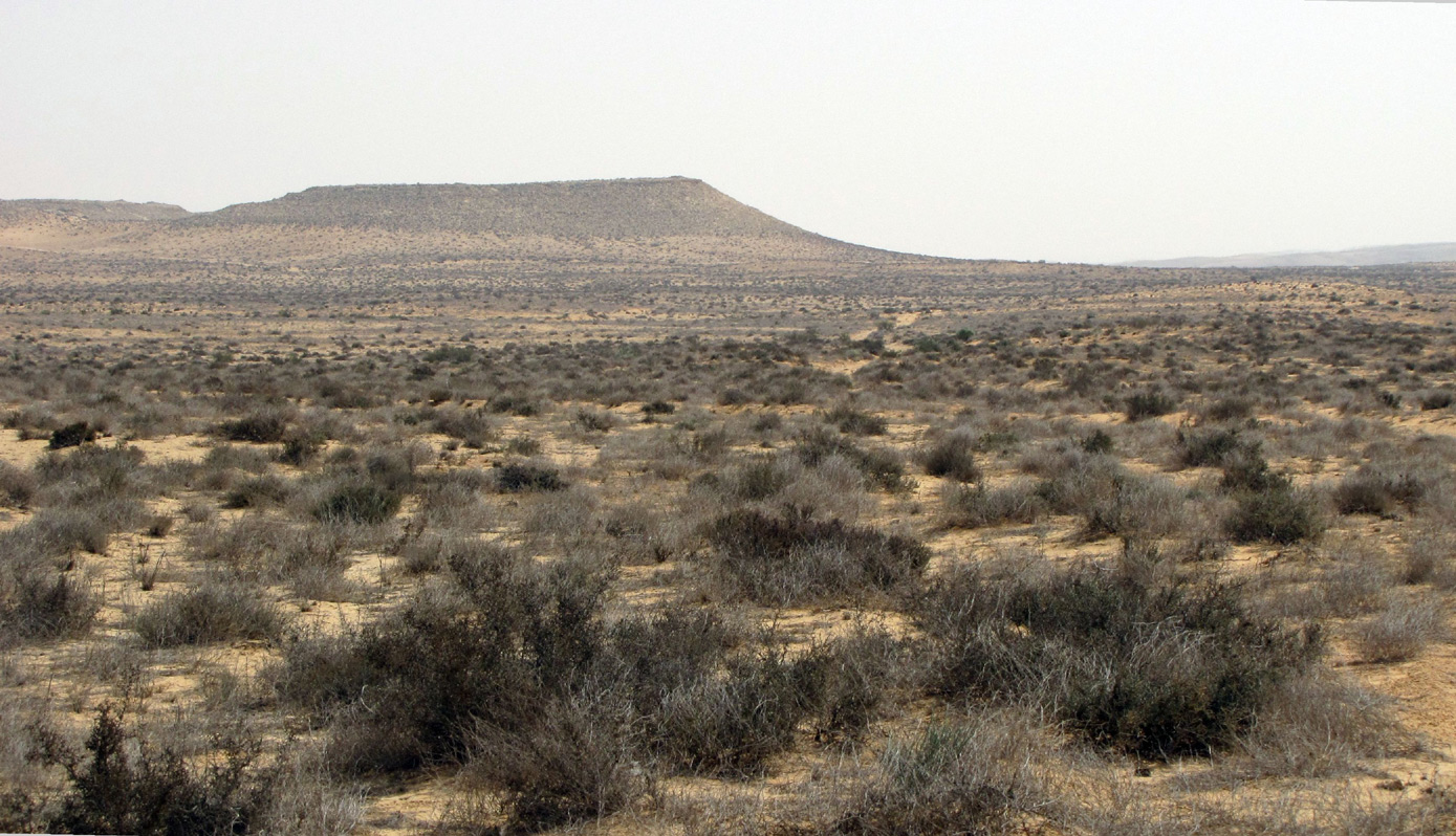 Песчано-лёссовая равнина у основания останцевой гряды. Плотный покров из смешанной растительности, с участием видов характерных для различных типов субстратов. Anabasis articulata, Artemisia herba alba, Noaea mucronata. На каменистой гряде распростронены типичные петрофитные группировки с доминированием Zygophyllum dumosum. [зима]