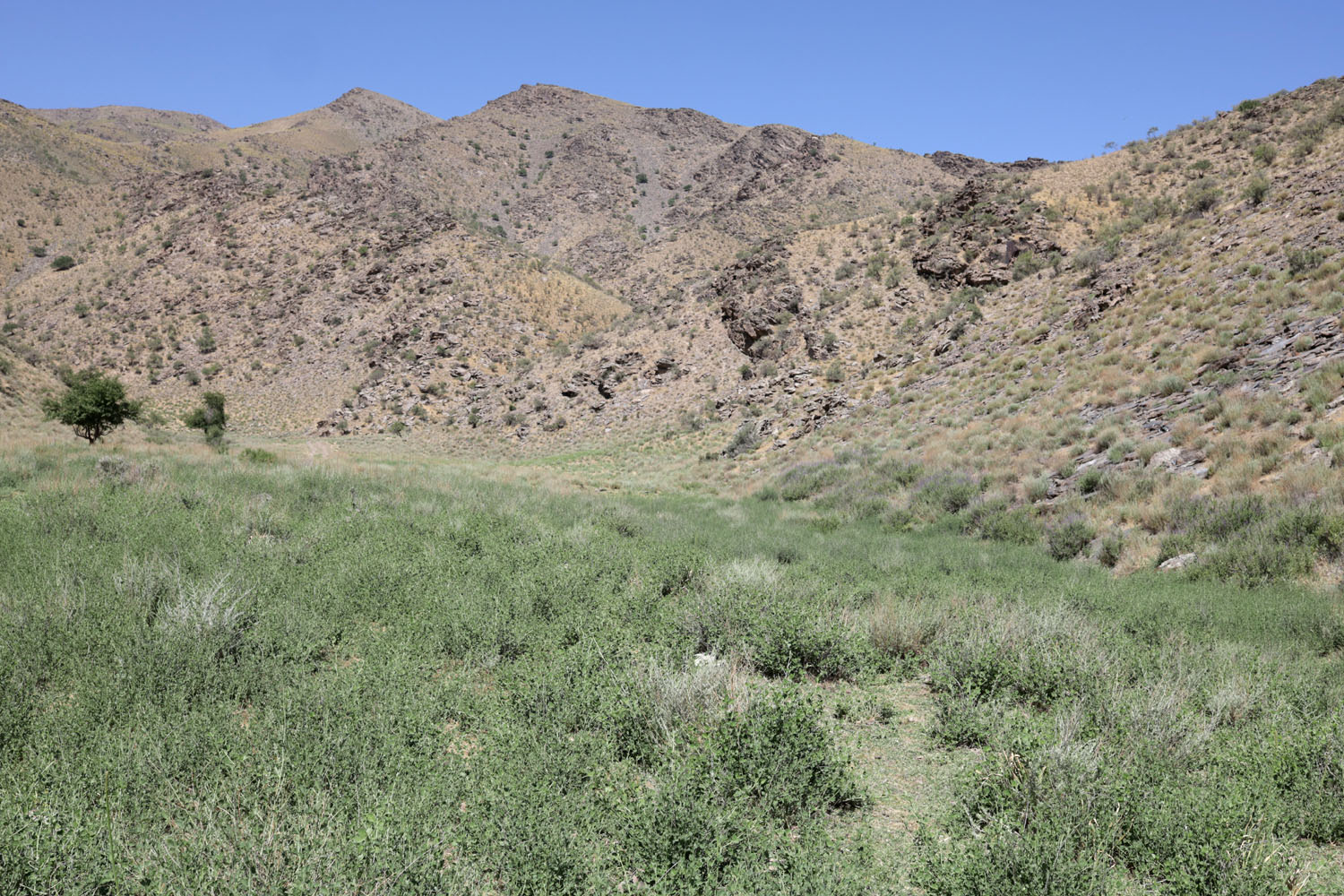 Заросли Meristotropis triphylla; на склонах гор растут Amygdalus spinosissima, Perovskia scrophulariifolia, Artemisia sp. и другие виды. 31 мая 2023 г. [лето]