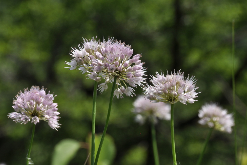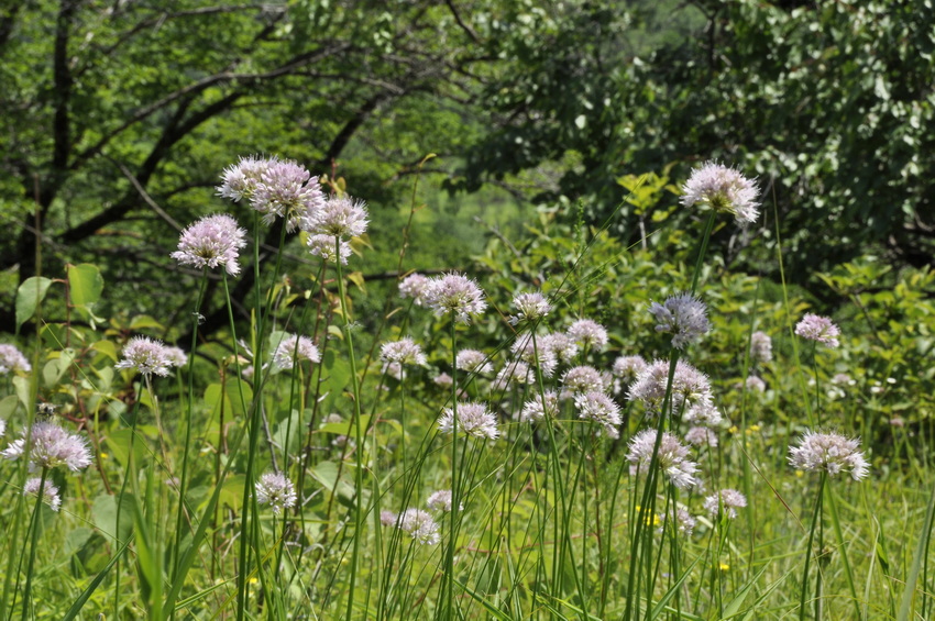 Фрагмент разнотравного луга на небольшой сопке. Аспектирует лук Проханова (Allium prokhanovii). Древостой по бровке склона представлен Armeniaca mandshurica, Quercus mongolica, Ulmus japonica(?) и др. 06.07.2022. [лето]