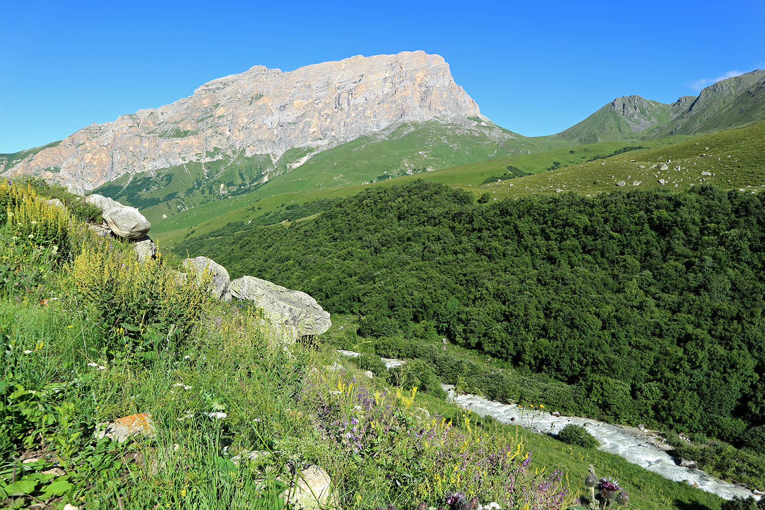 Куртины цветущих Verbascum laxum на крутом склоне по левому борту долины реки. Отсюда можно видеть практически первый густой берёзовый лес (Betula spp.) с многочисленными ивами (Salix caprea), растущими ближе к воде. Вдали — скалистая вершина горы Хазнибаши. 29.07.2024. [лето]
