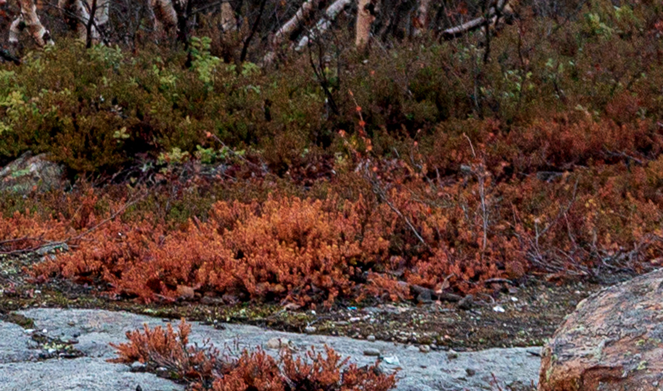На склоне горы редкий берёзовый лес, почти сбросивший осеннюю листву; внизу среди зелёных зарослей Empetrum hermaphroditum ярким рыжим пятном выделяется погибшая куртина. 25.10.2024. [осень]