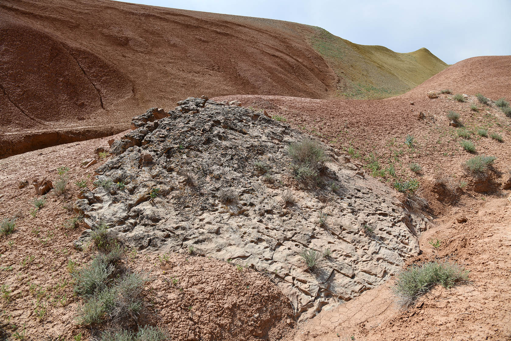 Частично обнажённая плита песчаника; вокруг, и на самой плите, растут кустики Artemisia, Caccinia macranthera и цветущие Glaucium elegans. 1 мая 2023 г. [весна]