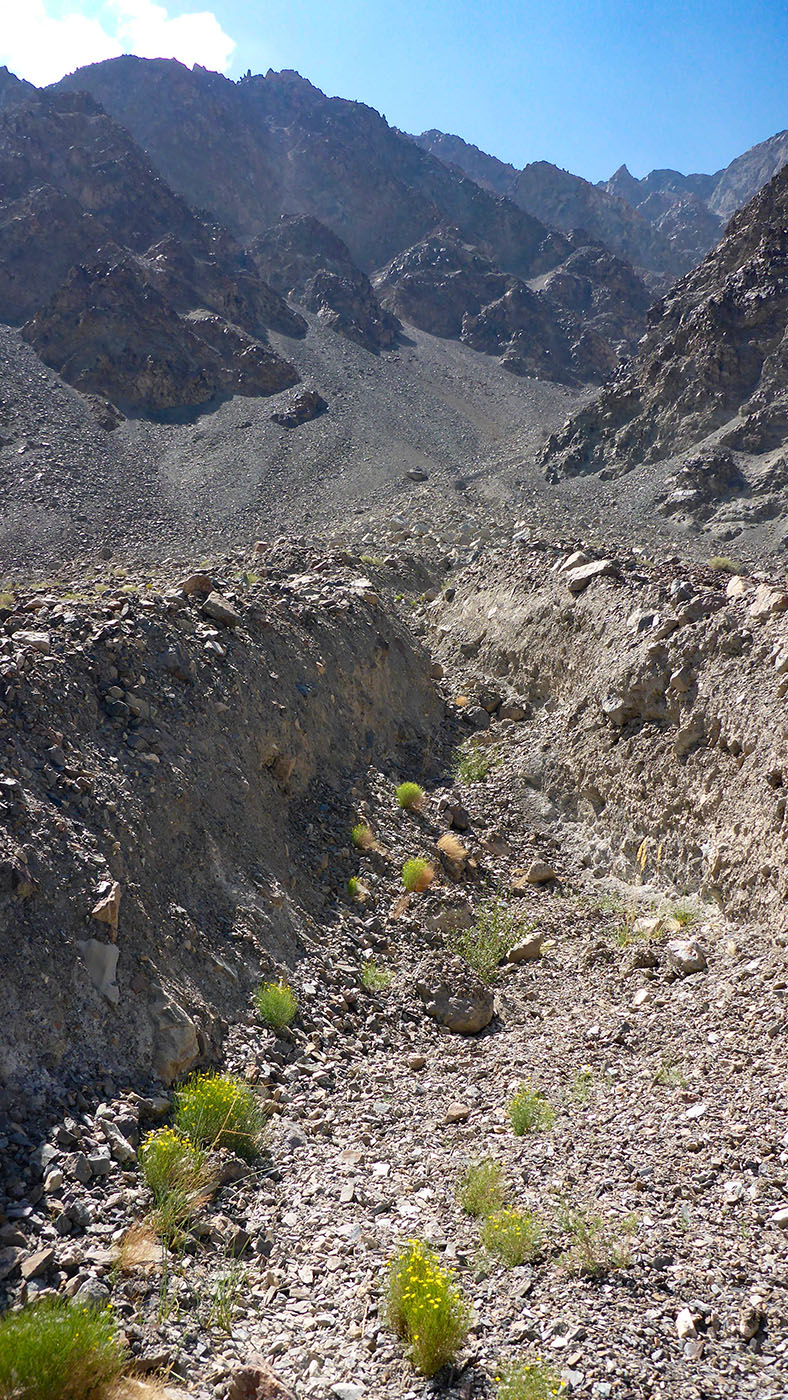 Глубокое и широкое русло селевого потока обрывается в озеро, полностью забитое плавником из ветвей и стволов Salix schugnanica и Betula pamirica. Видны цветущие куртины Youngia tenuifolia. 7 июля 2025 г. [лето]