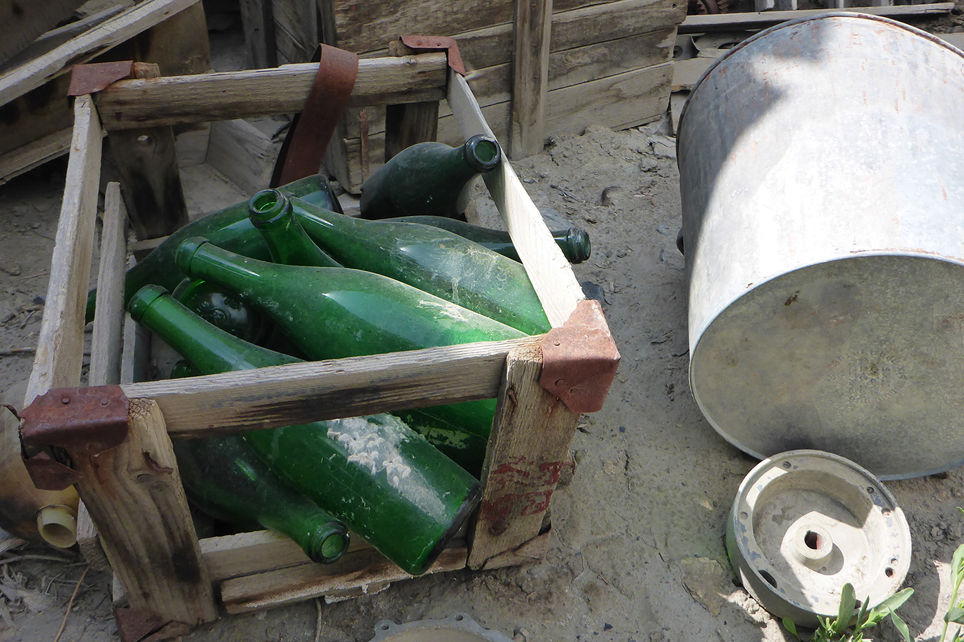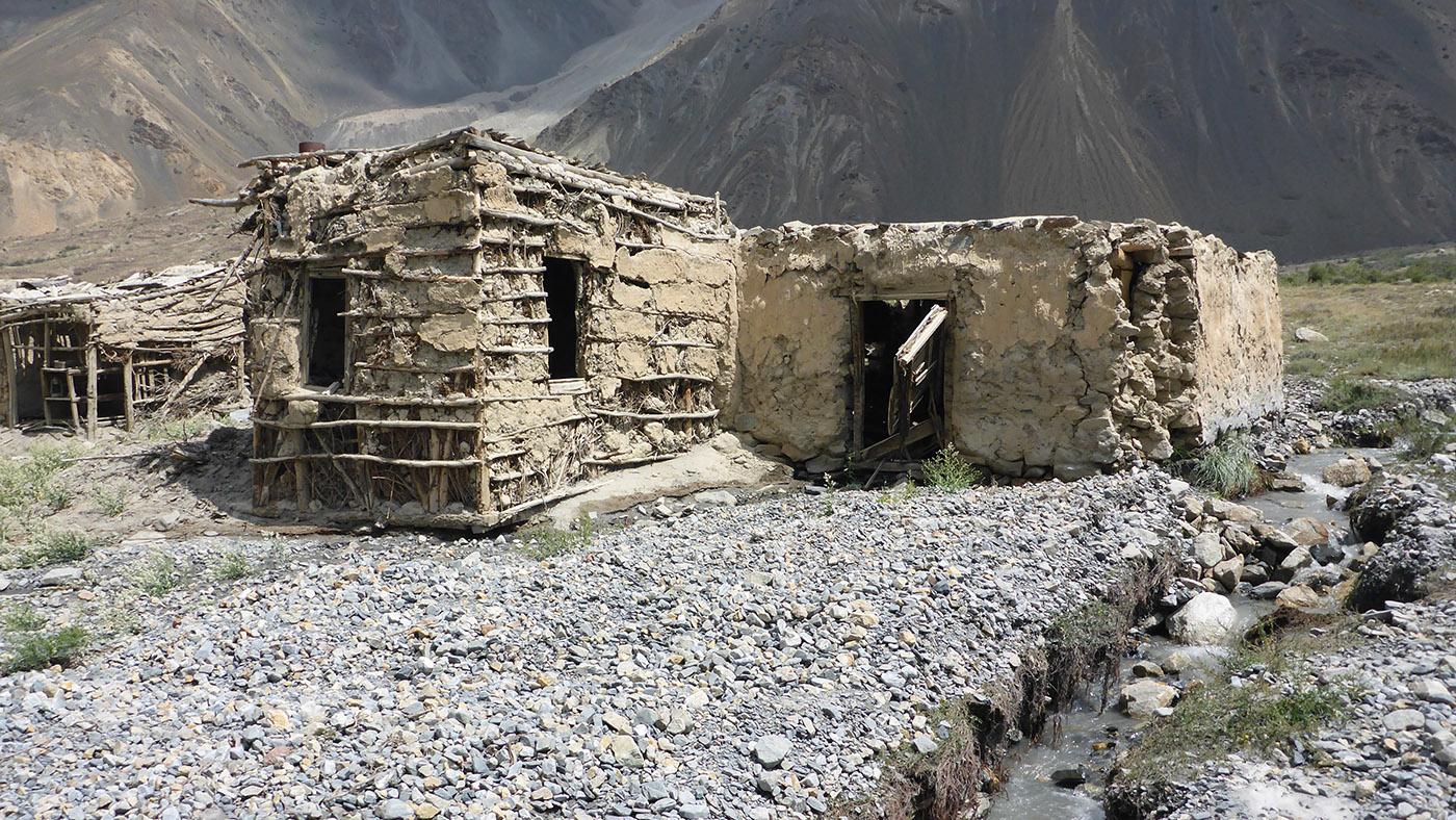 Руины первой метеостанции Ирхт, построенной в 1938 г. — вокруг соседствует рудеральная и колюче-подушечная высокогорная растительность — видны куртины цветущих Lepidium latifolium и Acantholimon pamiricum; зелёными пятнами виднеются кусты плодоносящей Lonicera microphylla и невысокие деревья Juniperus semiglobosa. 8 июля 2025 г. [лето]