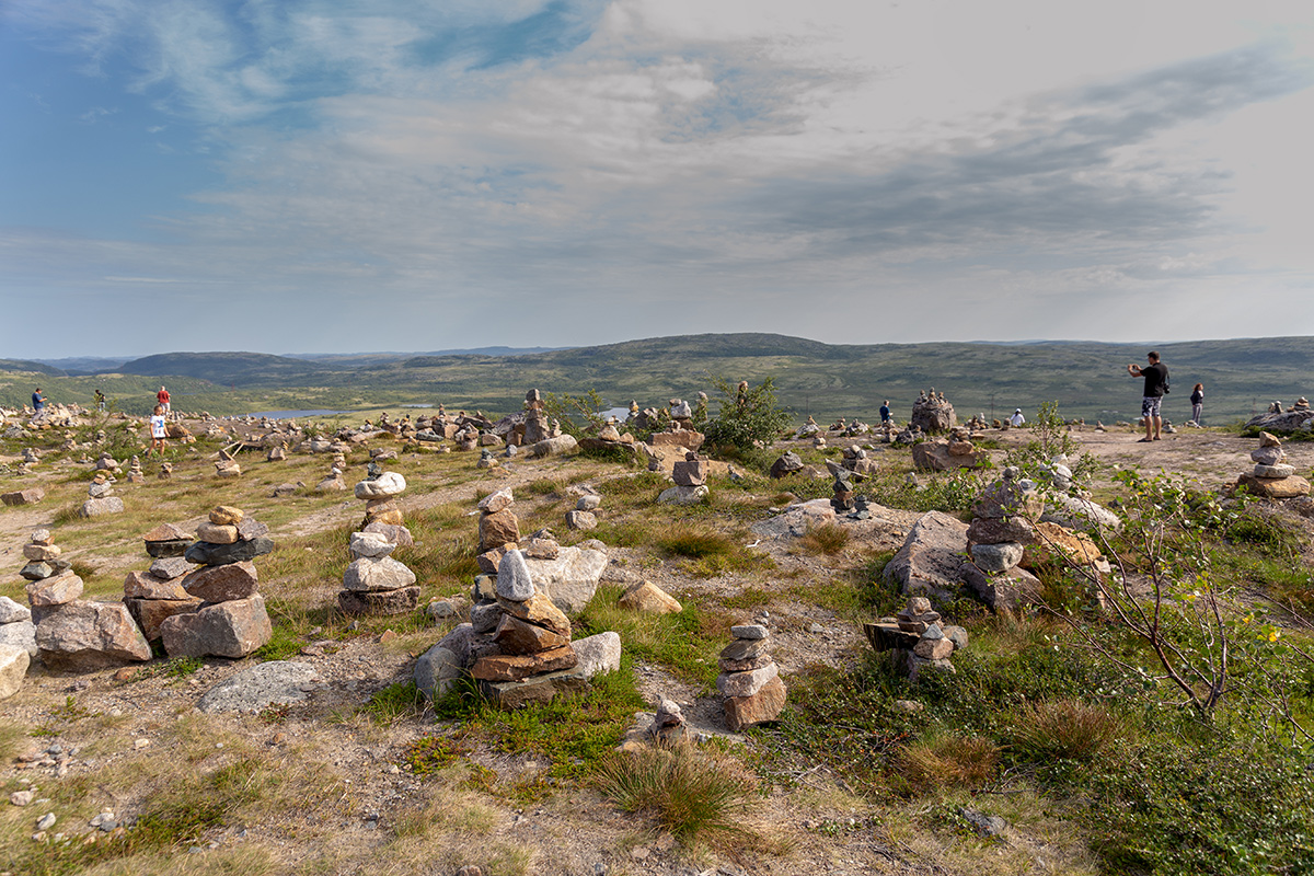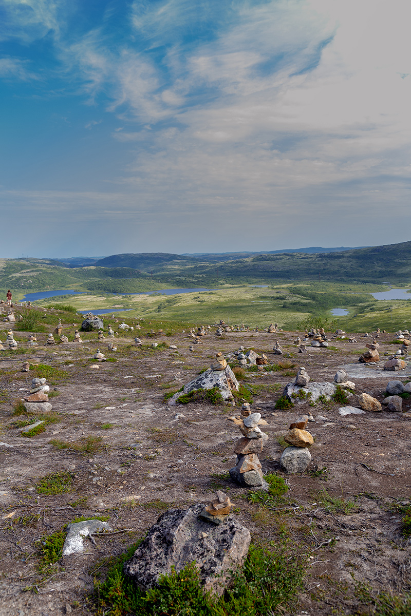 Смотровая точка по дороге в Териберку. На скалистых возвышенностяx — малоснежная каменистая кустарничково-лишайниковая тундра. На склоне на переднем плане — ёрниковая берёзовая лесотундра с деревцами Betula czerepanovii(?). В депрессии — мезотрофные осоково-пушицевые болота. 02.08.2025. [лето]