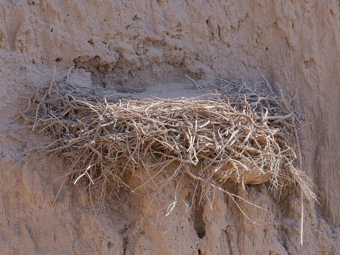 Пологий склон промоины с высохшими кустиками Salsola arbusculiformis, плодоносящими Haloxylon aphyllum и и отвесная стена противоположного склона с гнездом птицы (вероятно, курганника). 20 сентября 2025 г. [осень]