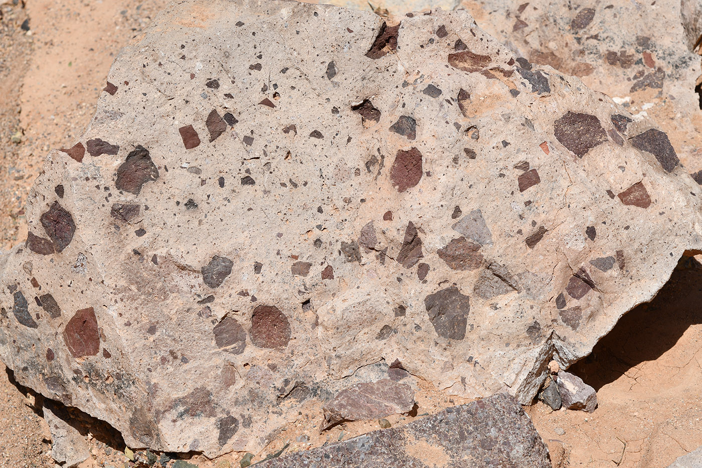 Русло временного водотока заполнено эрозионными продуктами пестроцветных толщ разного геологического возраста; по щебнистым склонам растут Atraphaxis virgata, Ephedra equisetina, Ferula ovina; у самого "уреза ручья" — Artemisia juncea, Rindera tetraspis. 6 июня 2025 г. [лето]