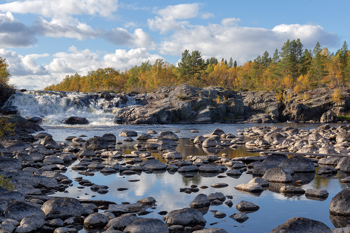 Вид на водопад. На переднем плане — мелководье с многочисленными валунами и плоскими гранитными (?) плитами. По берегам — редколесье из Betula czerepanovii в осеннем аспекте и Pinus friesiana, с примесью Salix. 14.09.2025. [осень]