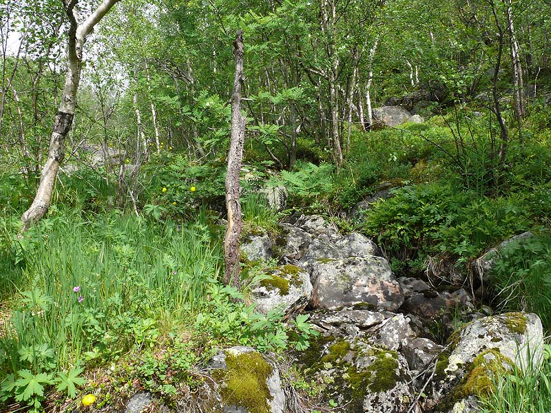 | Дмитрий Орешкин | Мне кажется, здесь несколько другой вариант - каменная россыпь (морена?) оказалась в понижении; по большей части она заросла, а по тальвегу временные потоки смывают детрит и предотвращают образование почвы и дернины. |