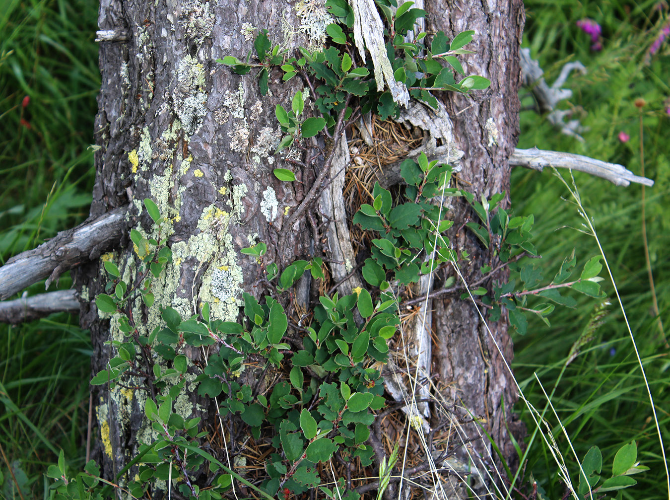 Ветви кустарника в основании ствола сосны. Карачаево-Черкесия, Тебердинский заповедник, хр. Малая Хатипара, сосновый лес. 13.07.2017.