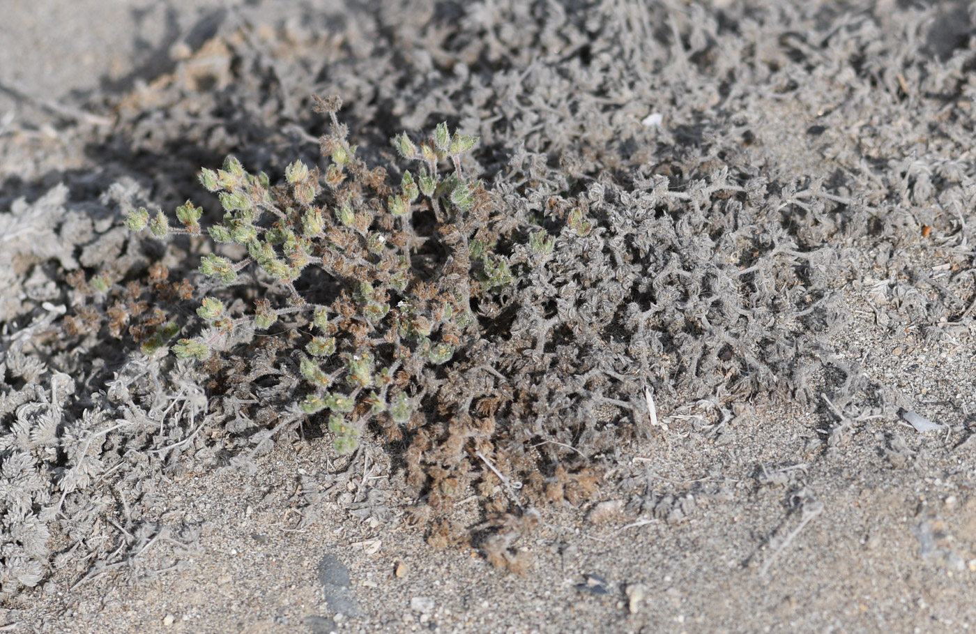 Растение с цветками и сухими веточками. Перу, регион La Libertad, пос. Huanchaco, закреплённые дюны. 24.10.2019.