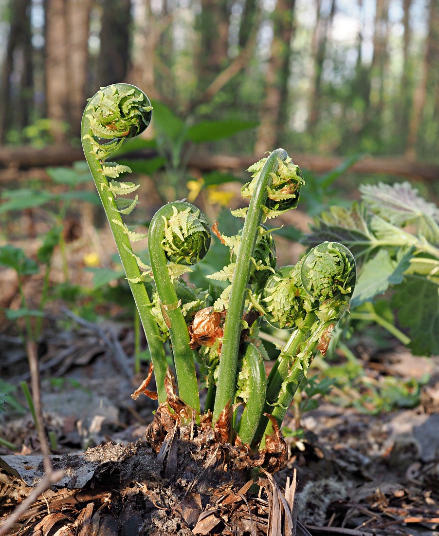 Разворачивающиеся вайи вегетирующего растения. Ульяновская обл, окр. г. Димитровград, пойма р. Мал. Ерыкла, переходящий в заболоченный ольшаник широколиственно-сосновый лес. 27.04.2023.