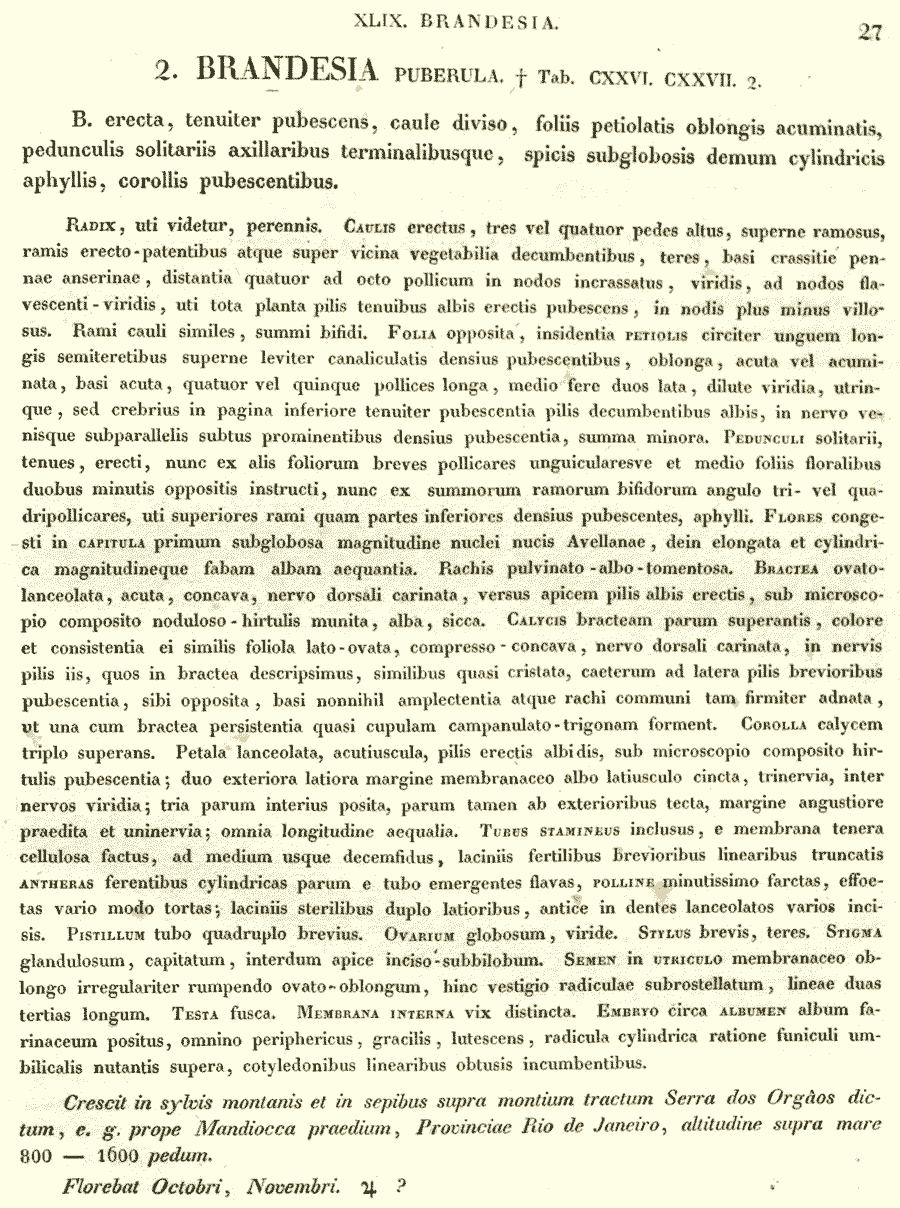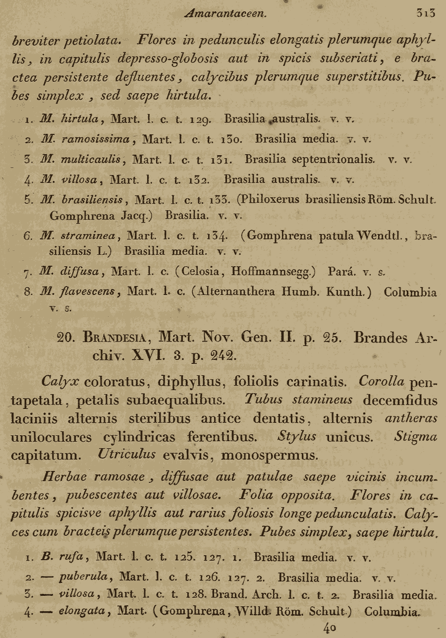 | Андрей Ковальчук | Род Brandesia Mart. был описан Мартиусом в работе "Beitrag zur Kenntnis der natülichen Familie Amarantaceen" (105. 1825), которая вышла отдельным препринтом в 1825 г. Найти именно это издание у меня не получилось, но эта же работа в 1826 г. вышла в журнале "Nova acta physico-medica Academiae Caesareae Leopoldino-Carolinae Naturae Curiosum" 13(5,1). Нижеприведённый фрагмент взят из издания 1826 г.