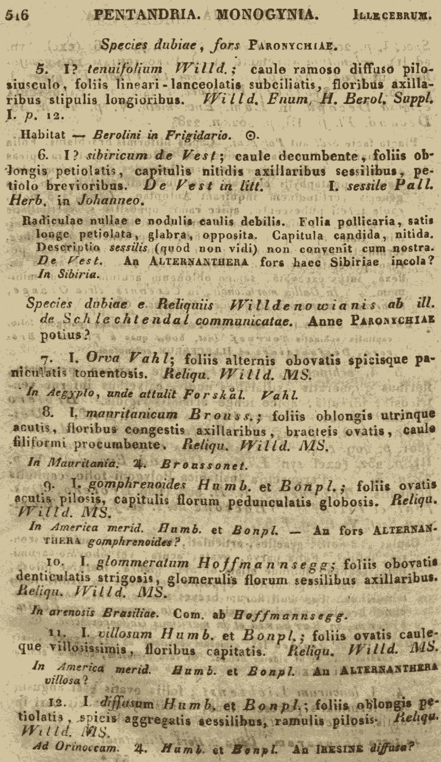 Протолог Illecebrum gomphrenoides Willd. ex Schult. (Systema Vegetabilium, ed. 15 bis [Roemer & Schultes] 5: 516. 1819):