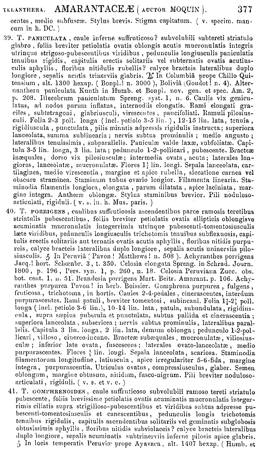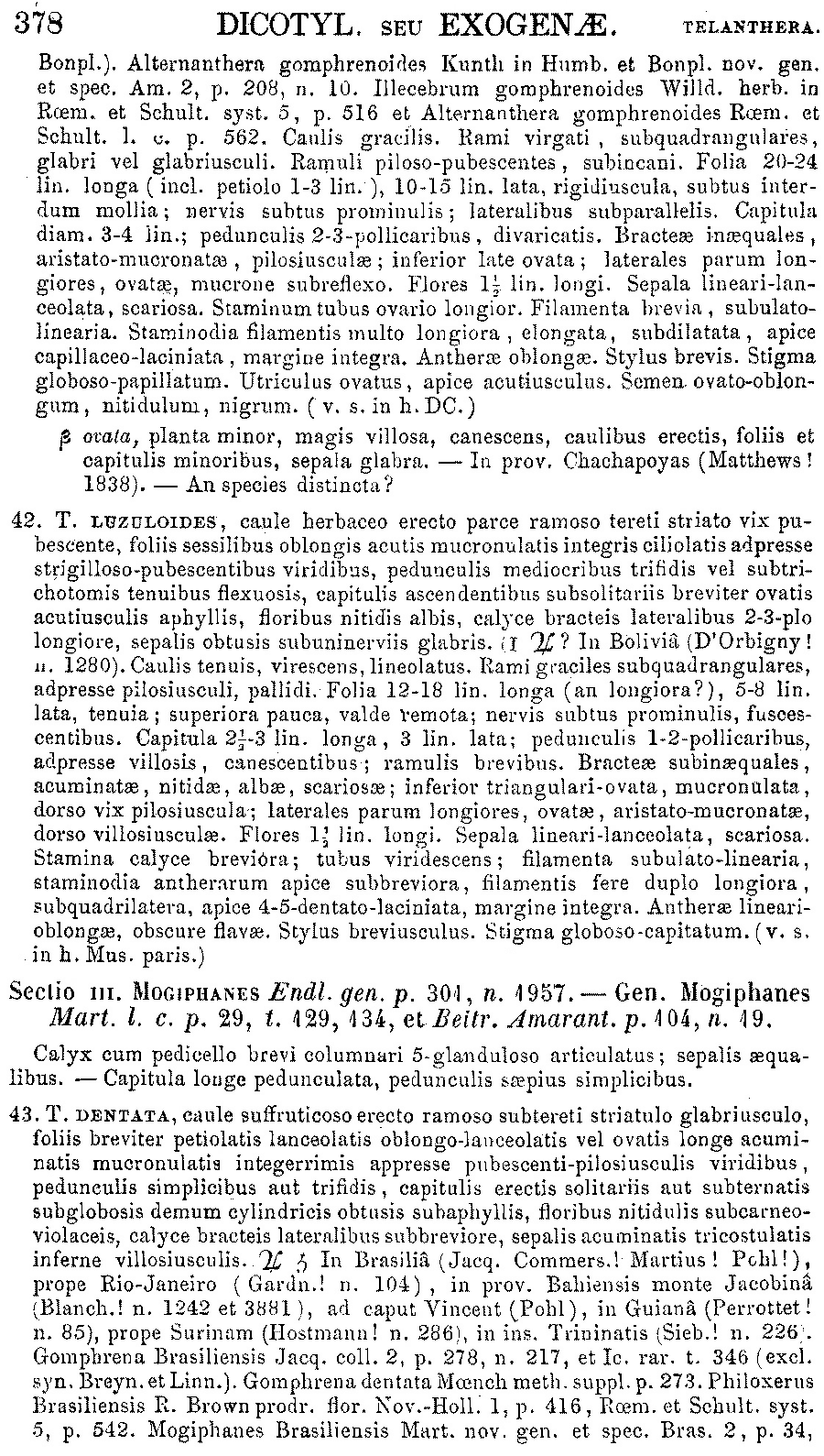 Обнародование комбинаций Achyranthes purpurea Pav. ex Moq., nom. inval. (Prodromus Systematis Naturalis Regni Vegetabilis [A. P. de Candolle] 13(2): 377. 1849), Gomphrena fruticosa Moq., nom. inval. (Prodromus Systematis Naturalis Regni Vegetabilis [A. P. de Candolle] 13(2): 377. 1849), Gomphrena fulgens Moq., nom. inval. (Prodromus Systematis Naturalis Regni Vegetabilis [A. P. de Candolle] 13(2): 377. 1849), Gomphrena purpurea Moq., nom. inval. (Prodromus Systematis Naturalis Regni Vegetabilis [A. P. de Candolle] 13(2): 377. 1849) и Gomphrena trichotoma Moq., nom. inval. (Prodromus Systematis Naturalis Regni Vegetabilis [A. P. de Candolle] 13(2): 377. 1849) и протолог Telanthera gomphrenoides var. ovata Moq. (Prodromus Systematis Naturalis Regni Vegetabilis [A. P. de Candolle] 13(2): 378. 1849) и Telanthera luzuloides Moq. (Prodromus Systematis Naturalis Regni Vegetabilis [A. P. de Candolle] 13(2): 378. 1849):