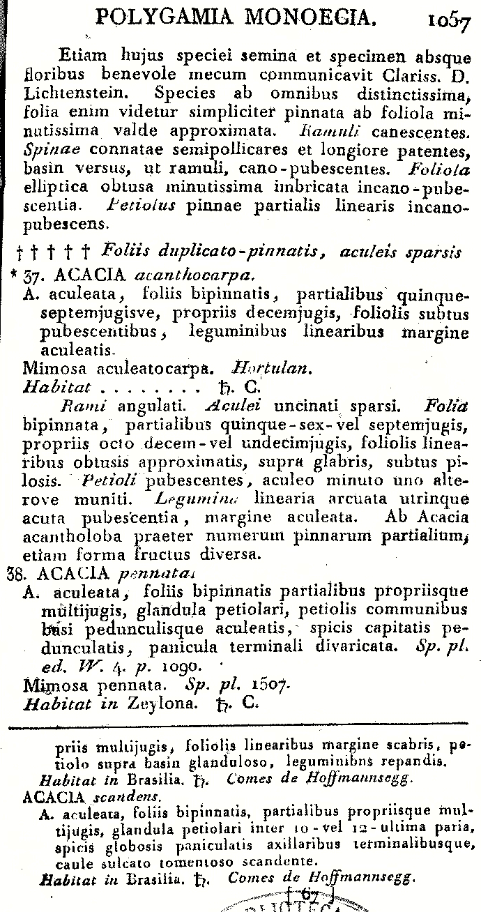 Протолог Acacia acanthocarpa Willd. (Enumeratio Plantarum Horti Regii Botanici Berolinensis [Willdenow] 2: 1057. 1809):