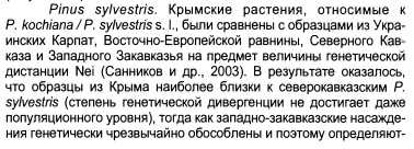 | Николай Степанов | Раз генетики сказали: то, что в Крыму определялось как "Pinus kochiana" - это было ошибкой. Там сосны, хоть и обособлены в некотором смысле, но должны быть отнесены к P. sylvestris s.lat. Обособленность крымских сосен может быть обозначена на уровне подвида, разновидности, но как таксон они не описаны. Поэтому и можно перенести к P. sylvestris, не погрешив против истины. |