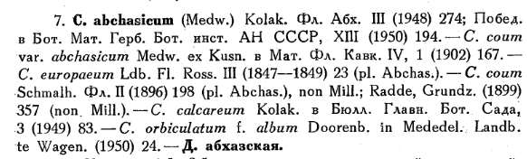 | Виктор Кишиневский | C. abchasicum как самостоятельный вид многими не признается ( POWO, wfo, Тахтаджян А.Л. Конспект флоры Кавказа. Т. 3, ч. 2, Зернов А.С. Флора Северо-Западного Кавказа и др.). А в Иванов А.Л. КОНСПЕКТ ФЛОРЫ РОССИЙСКОГО КАВКАЗА (сосудистые растения) указан только C. coum. Более того авторство C. abchasicum в разных источниках разное. У нас например (Medw. ex Kusn.) Kolak., в IPNI Kolak. ex Pobed., в POWO (Medw.) Kolak. ex Pobed., в Euro+Med (Kusn.) Kolak..