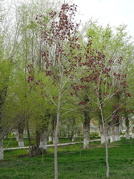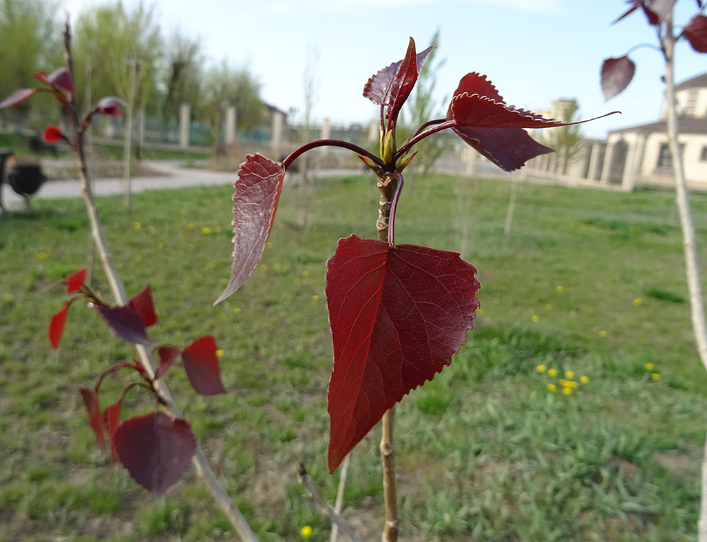| Людмила Султанова | А кажись, действительно тополь! Тополь дельтовидный! Purple Tower. Populus deltoides. На Плантариуме даже есть похожая картинка - только листочки не совсем красные, только по краям. В интернете нашла полностью красные, совсем как в нашем парке. Из описания поняла, что красными листья бывают в период вегетации, потом позеленеют. Ну вот, теперь буду знать.