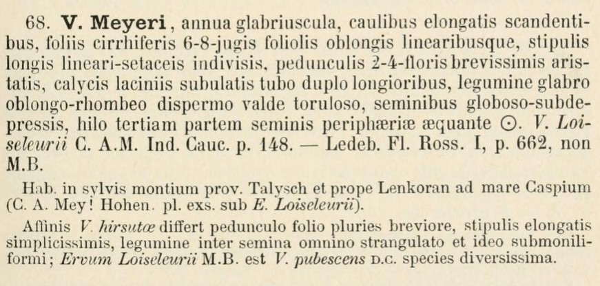2. В IPNI есть Vicia loiseleurii Boiss. со ссылкой на Fl. Orient. [Boissier] 2: 595, sphalm. , но там Ervum loiseleurii non. M.B., а Vicia meyeri Boiss. у нас и в POWO в синонимах.