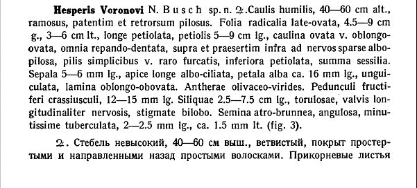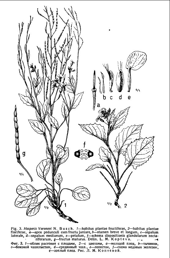 "Ю. Н. на этикетке назвал этот вид Н. circassica, но описания не дал. Называю этот вид, сильно отличающийся от остальных кавказских видов рода Hesperis малым ростом, очень широкими листьями, оливково-зелеными пыльниками и короткими плодами, в память Ю. Н. Воронова."