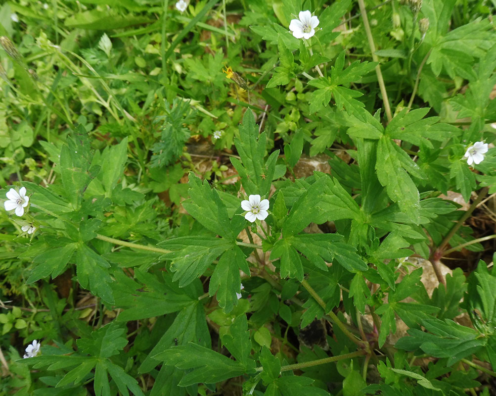 Цветки как у герани, только мелкие, 7--8 мм в диаметре. Цвет белый. Стебель ползучий. Юг Среднего Урала.