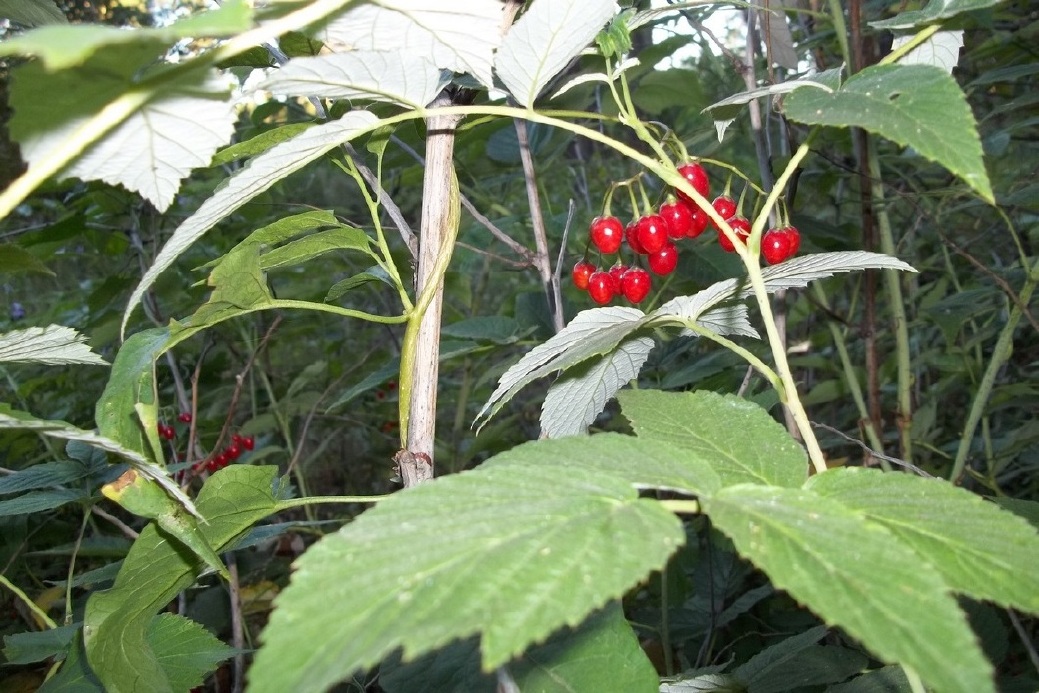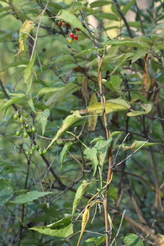 | Вячеслав Трофимов | Как-то возвращаясь с прогулки по прибрежному лесу случайно увидел на высоте полутора метров яркие плоды паслена сладко-горького. Чуть ниже увидел цветки, а еще чуть ниже - кисть с зелеными плодами. Внимательно осмотрев, увидел, что паслен "взобрался" на такую высоту опираясь на высокий побег красной бузины. Немного левее еще один куст поднялся еще выше. Такое я увидел впервые. В лесу паслен этого вида встречается часто, но это в основном небольшие, низкорослые кусты. Ниже привожу две фотографии. |