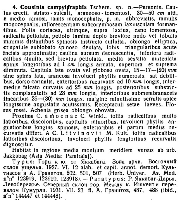 | Дмитрий Орешкин | В IPNI и POWO - Cousinia campyl araphis Tschern., у нас (как в "Черепанове" и "Флоре СССР") - "campyl oraphis".