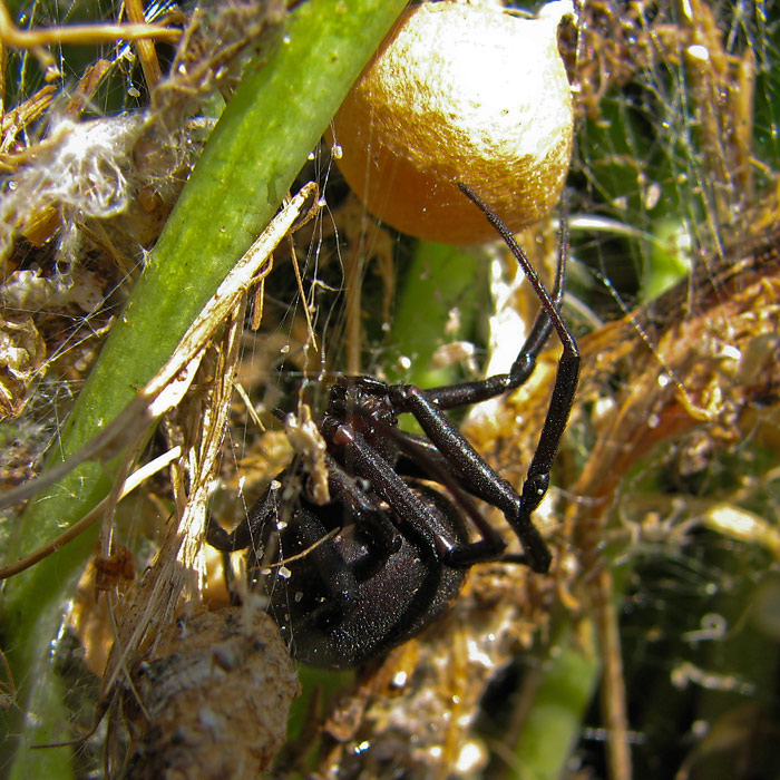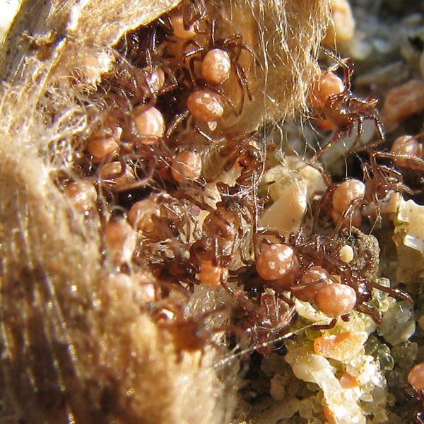 В литературе по разному написано, как каракурт перезимовывает, вот я и проверял. Оказывается паучата выводятся осенью и сидят в коконе до весны. Этот снимок сделан в декабре. Интересно, что при температуре чуть выше нуля, паучата были весьма активны. Размер каждого паучка до 1 мм.