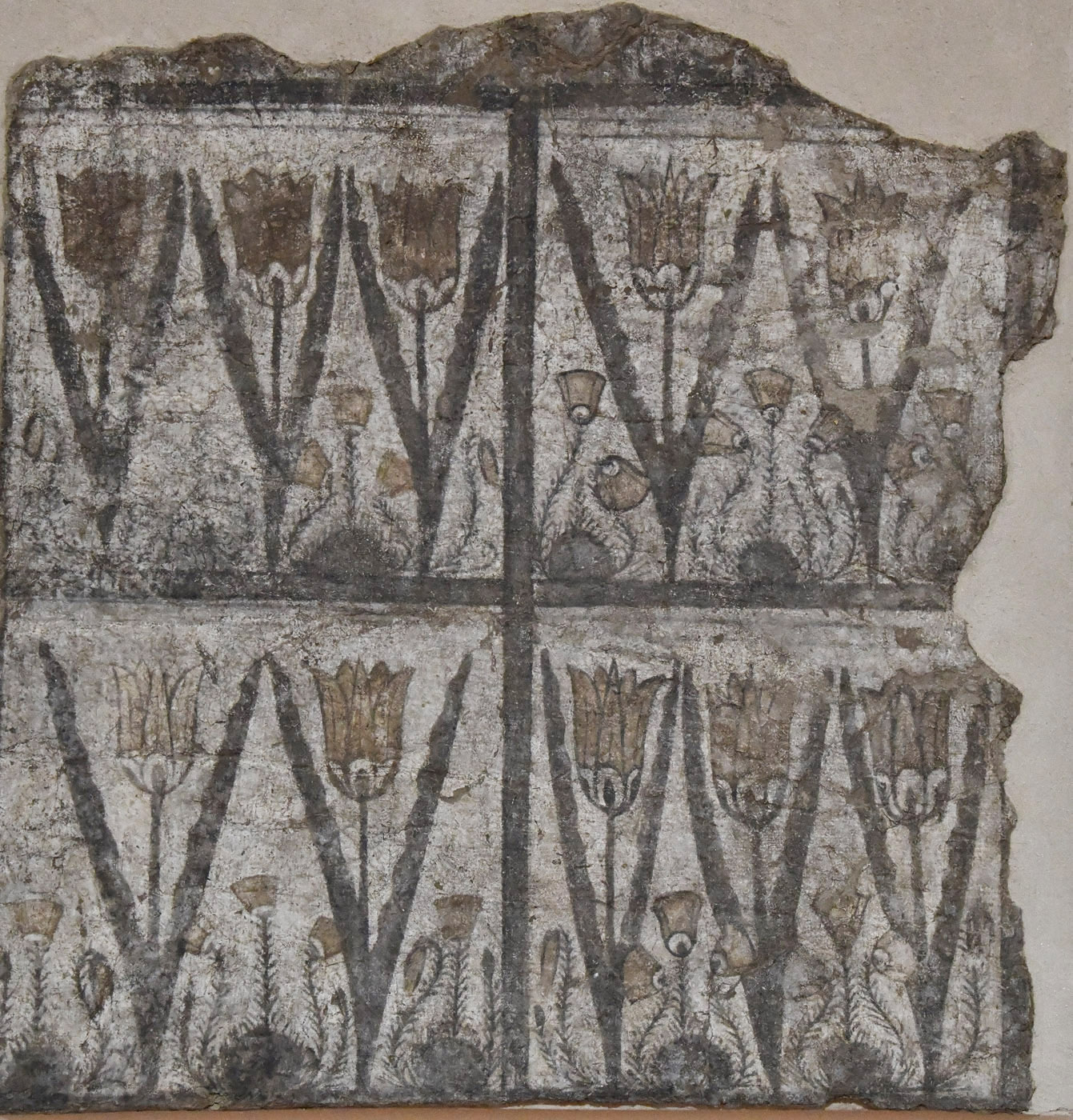 | Владимир Панкратов | Настенная роспись из Пенджикента (Музей древностей. г. Душанбе). За столетия краски немного померкли, но всё равно видно, что художник изобразил венчики тюльпанов различающиеся по цвету. Может уже тогда были разные сорта? Papaver pavoninum тоже хорошо различим. |
