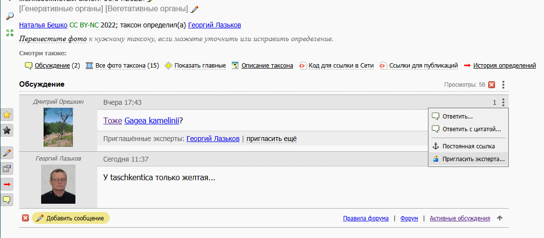 | Павел Евсеенков | Иногда друзья просят меня поопределять им фоточки на iNaturalist, и я подсмотрел там одну очень полезную, на мой взгляд, фишку. Заключается в том, что в обсуждении можно тегнуть кого-либо из участников проекта, и ему придёт соответствующее уведомление: "Вася Пупкин упомянул Вас в обсуждении таком-то". Выглядит так: @Павел Евсеенков. Возможно ли реализовать подобное на Плантариуме ? Есть специалисты, которые на сайте зарегистрированы, но заглядывают крайне редко. Такой способ обратить внимание кажется мне более изящным, чем писать сообщение через форму обратной связи. |