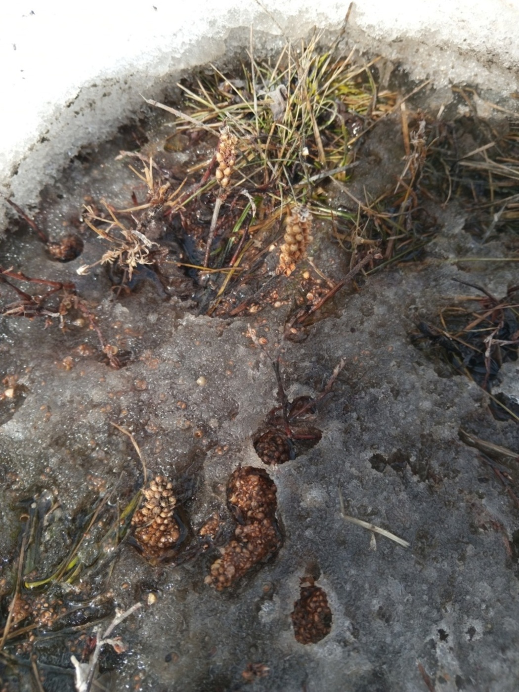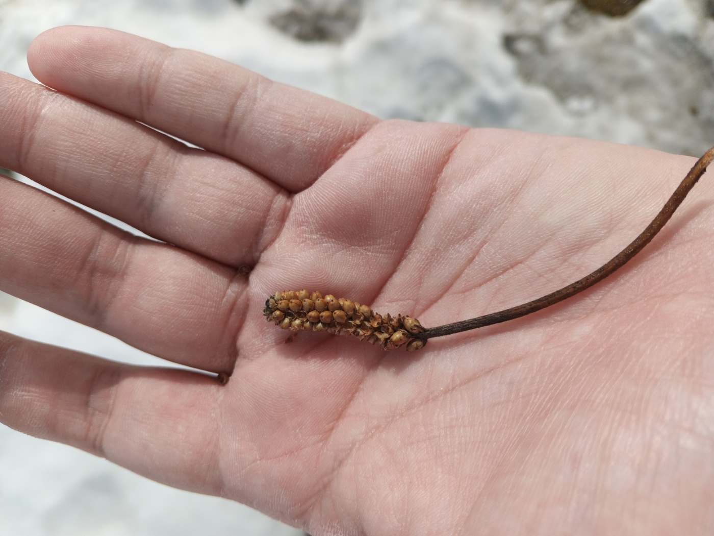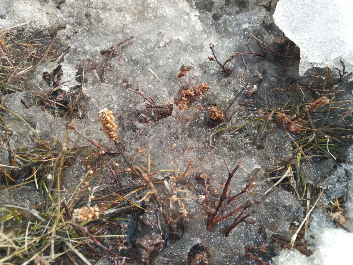 Под сугробом на газоне нашёл соплодие. От двух человек две версии услышал: Orobanchaceae или что-то из подорожников.