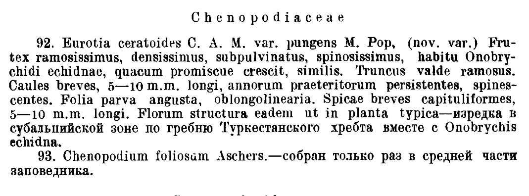 | Виктор Кишиневский | Должен быть, если сохранился, в Национальном гербарии Узбекистана. Но сайт давно недоступен. Там же должны быть гербарные образцы Ceratoides pungens (Popov) Czer. более поздних сборов. |