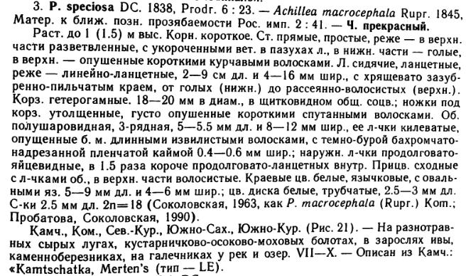 | Александр Эбель | Если в сводке "Сосудистые растения СДВ" (т. 6, с. 101) написана правда, то правильное название должно быть Ptarmica speciosa DC. Смущает то, что этот том вышел в 1992 г. - С.К. Черепанов должен был его проштудировать... |