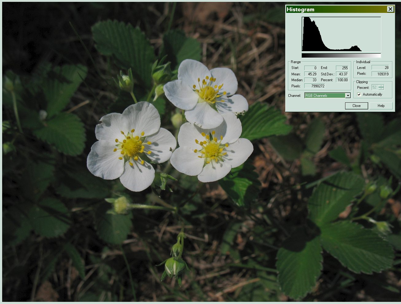 Посмотрите приложенные файлы. Первый - скриншот от Ирфана (с плагином Гистограма). Второй - из окна программы Ulead PhotoImpact 12. Кстати, очень рекомендую эту программу тем, кто не хочет заморачиваться с долгим редвактированием и получать быстро приемлемые результаты "на автомате": там всё автоматизировано для неопытных фотографов.