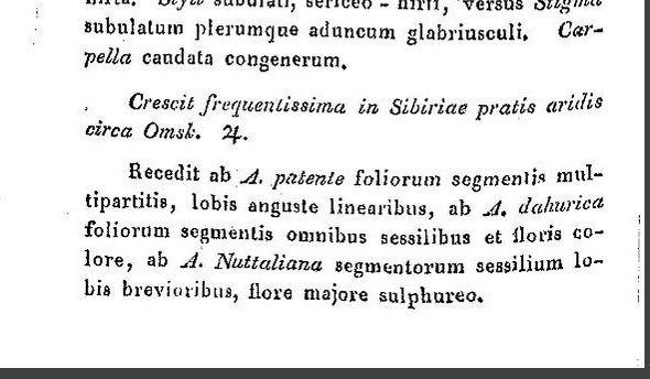 Как же без оговорок? p.p. после Флоры СССР 7, 296 - Это и есть "pro parte". а) нет б) именно новый вид. Так как есть большая вероятность, что описанный из полосы перекрытия близких видов Anemone flavescens Zucc. является гибридом P.patens и P.orientali-sibirica.