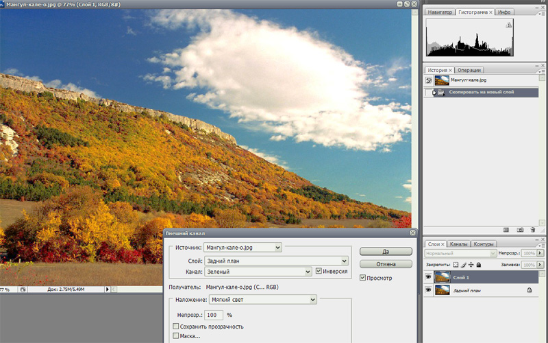 2. На нем "Внешний канал" с параметрами как на рисунке. Обращаю внимание на: источник - зеленый канал, обязательно инверсия; наложение - мягкий свет.