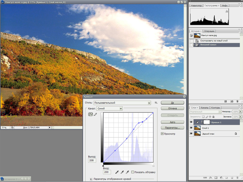 1. Осветлила левую часть неба. Создала новый слой, в который скопировала содержание синего канала. Режим наложения - Осветление(Screen), прозрачность что-то около 20%. Создала маску слоя, и по ней градиент от левого края к правому (правый осветлять не надо). Гору и всё остальное "не небо" на маске вытерла - его тоже не надо осветлять.