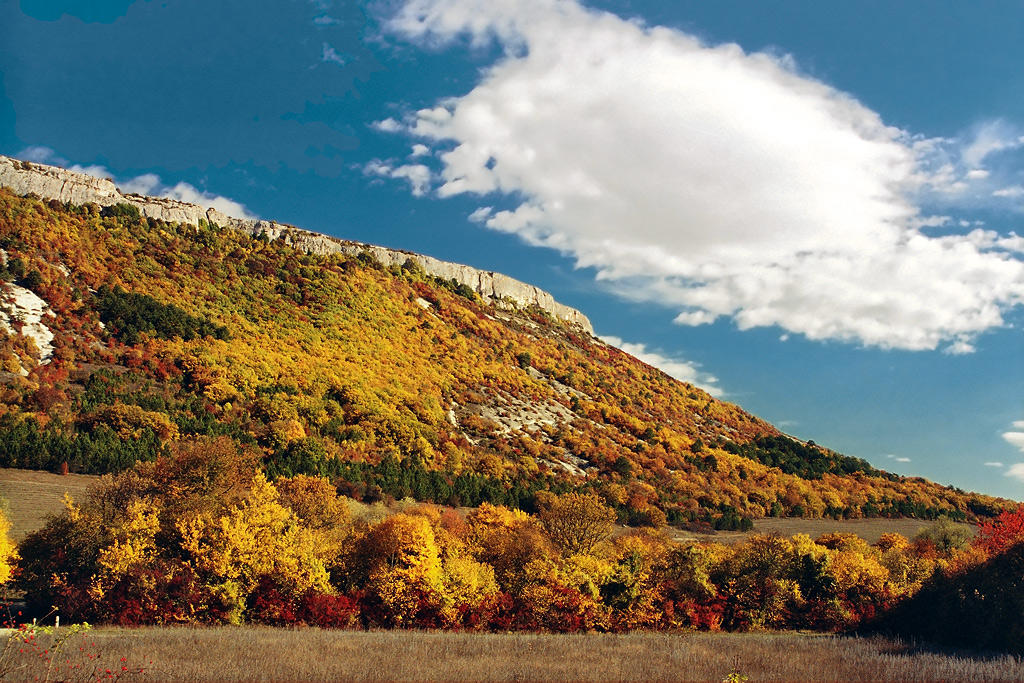 Так вот, облако оказывается у нас излишне красным, так как имеет заметные положительные значения в каналах a и b. Небо оказывается слишком зеленым в светлой части и слишком фиолетовым в темной части (канал a положителен). Цвета листвы вполне могут быть такими как они есть (но все же уж очень ядерно желтое), а вот скалы на мой взгляд тоже очень красные (возможно, что эти горы состоят как раз из красной породы, но, вообще, похоже на известняки), зелень хвойных имеет перебор желтого и недостаток зеленого (это не бросается в глаза только из-за контраста с желтой и красной листвой, но цифры не врут).